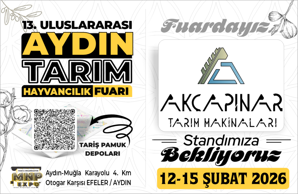 Yüksek Kaliteli Toprak İşleme ve Tarım Makineleri alanında hizmet veren AKÇAPINAR TARIM MAKİNALARI, 12-15 Şubat 2026 tarihleri arasında 13. Uluslararası Aydın Tarım Fuarı’nda sizleri standına bekliyor.