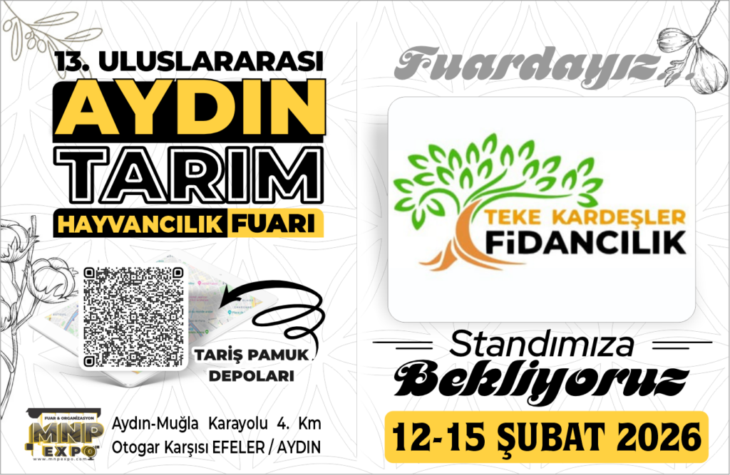 Zeytin, Erik, Elma, Kiraz, Üzüm, Madalina, Armut, Badem, Ceviz, Kayısı, Nektarin, Portakal, Şeftali Fidanları temini alanında hizmet veren TEKE KARDEŞLER FİDANCILIK, 12-15 Şubat 2026 tarihleri arasında 13. Uluslararası Aydın Tarım Fuarı’nda sizleri standına bekliyor.